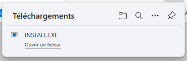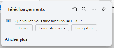 En haut, à droite de votre navigateur, vous devriez avoir une petite fenêtre qui s’affiche vous demandant ce que vous souhaitez faire avec INSTALL.EXE ?