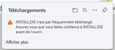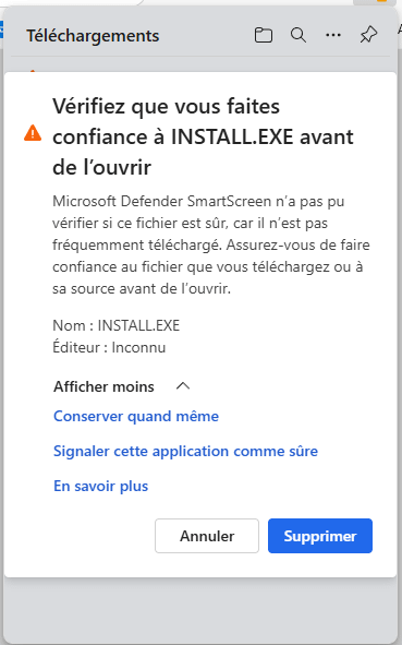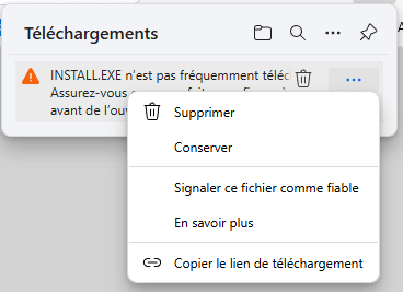 Une nouvelle fenêtre d’avertissement s’ouvre (Microsoft Edge est très prudent !)